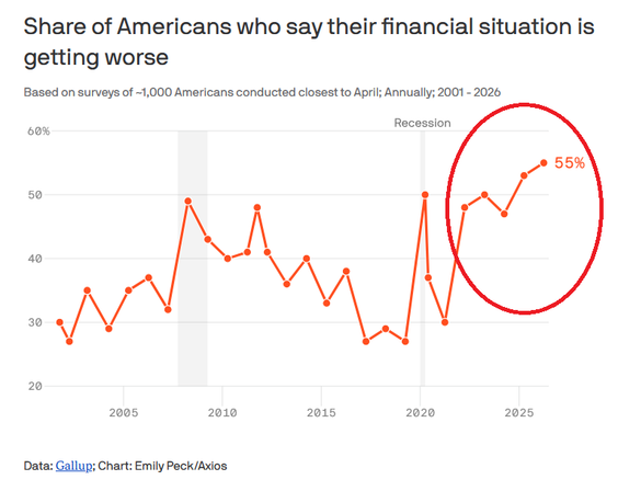 Ten odsetek jest najwyższym, jaki Gallup odnotował od czasu, gdy w 2001 roku zaczął pytać Amerykanów o ich finanse. Pokazuje to, że konsumenci są mniej optymistyczni niż podczas pandemii COVID-19 w 2020 roku i Wielkiej Recesji w w 2008 roku. I to już piąty rok z rzędu, w którym więcej Amerykanów twierdzi, że ich sytuacja finansowa się pogarsza niż poprawia.