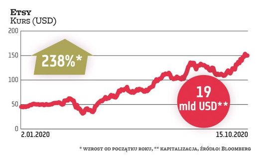 Rozwój platformy Etsy spowodował ogromny wzrost notowań. Od stycznia akcje spółki zdrożały o 238 proc. do najwyższego poziomu w historii. To najwyższa stopa zwrotu wśród spółek z S&P 500. Kapitalizacja Etsy wynosi 19 mld USD.