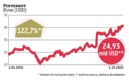 Najlepszym pod względem stopy zwrotu wśród notowanych na giełdach portali społecznościowych jest w tym roku Pinterest. Analitycy pokładają w spółce nadzieje i podnoszą swoje rekomendacje. Mimo że Pinterest osiągnął w ubiegłym kwartale stratę, cały rok ma zakończyć nad kreską, a 2021 r. ma być jeszcze lepszy.
